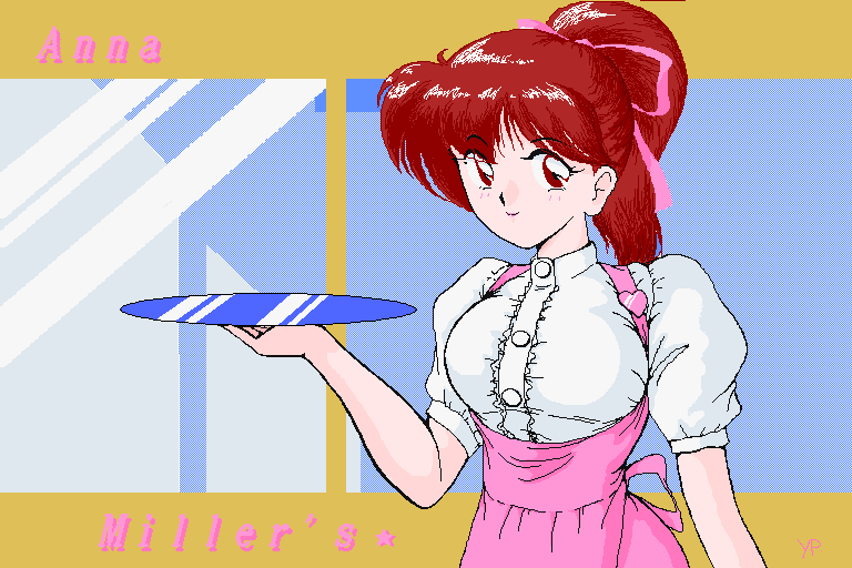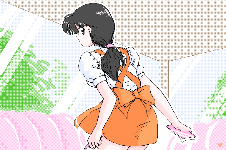 2度目の某アンミラということで、仙川店へ行った時の様子がもとになっています(^^;。アンミラといえば胸元が強調されることが多いので、趣向を変えてバックデザインが目立つように描いてみました。