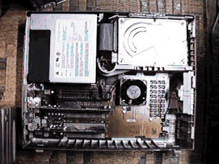 真ん中辺りでディスクユニットを固定してあるネジを外して、電源ユニット→ディスクユニット(&ケーブル類)→スピーカー→リセットスイッチ→マザーボードの順に外します。