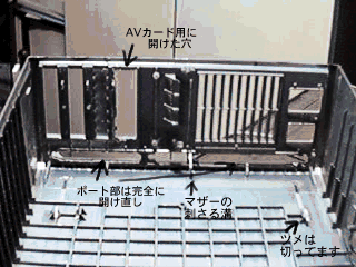 シールドが邪魔なので、最初にむしり取りましょう。あとは下図を参考に現物合わせでゴリゴリ穴開けに励んで下さい。